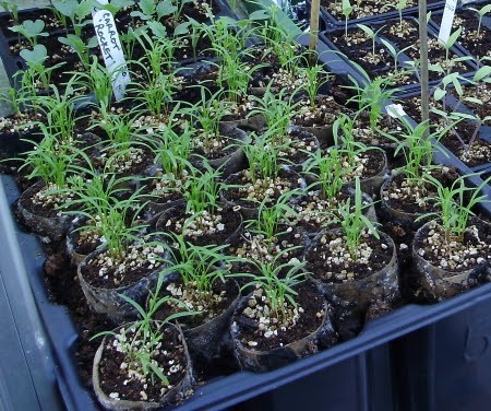 Make sure the cardboard rolls don’t stick up out of the compost too much or they will act like wicks – drawing out moisture and possibly drying out – which means they could then shrivel and kill tiny roots. These will be ready for planting out in the tunnel in clumps probably towards the end of next month when they have 2 ‘true’ leaves – each loo roll or clump spaced about 30 cm apart.