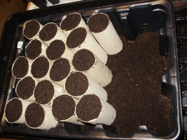 Early carrots in long modules like loo roll middles as in the pictures above. Sit the modules onto about 1/2-inch/1cm compost in something deep like a recycled plastic mushroom box to keep them upright and damp, (approx. 32 loo roll tubes will fit into a mushroom box). Fill them, and any gaps between them with seed compost. Then make a small depression about 1/2cm deep with the end of a pencil or similar, and sow a tiny pinch of seed into each, covering with vermiculite, then water them gently.